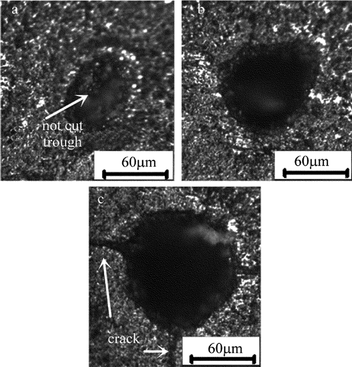 為了獲得聚晶立方氮化硼(PCBN)的激光切割質(zhì)量和切割效率,依據(jù)燒蝕直徑和入射激光脈沖能量的函數(shù)關(guān)系,得出PCBN燒蝕閾值為1.796J/cm2。采用Nd:YAG激光器對型號為BN250的PCBN進(jìn)行切割試驗,分析了切割速率、激光功率以及脈沖頻率對切割質(zhì)量的影響規(guī)律。通過切縫的顯微觀測對比,總結(jié)出不同激光工藝參量下PCBN縫寬的變化趨勢。