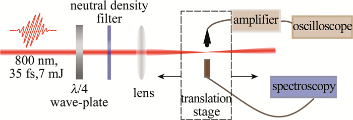 研究飛秒激光成絲的熒光輻射以及實現(xiàn)對其長度的表征,有利于揭示飛秒激光成絲中“激射”現(xiàn)象的本質(zhì)。為此,本文作者設(shè)計了實驗裝置,測量了空氣中光絲不同位置處發(fā)出的熒光信號,通過改變?nèi)肷浼す獾拿}沖能量和偏振狀態(tài)來研究熒光信號的變化; 同時,采用聲音測量法對光絲做進(jìn)一步測量,通過兩種方法的結(jié)合對等離子體光絲進(jìn)行長度表征。