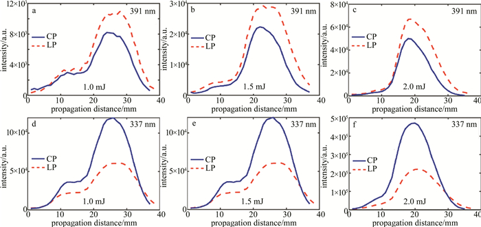 沿著光的傳播方向移動光纖探頭,可以測量飛秒光絲不同位置處的熒光信號。如圖 3所示,為入射激光能量分別為1.0 mJ,1.5 mJ和2.0 mJ時,激光的偏振態(tài)分別為線偏振和圓偏振情況下,測量得到391 nm處的N2+熒光信號強度和337 nm處的N2熒光信號強度隨光傳輸距離的變化??梢园l(fā)現(xiàn),在3種不同的入射激光能量下,光絲中心位置處337 nm的熒光信號在圓偏振光作用下的強度約為線偏振態(tài)下的2倍,而391 nm的熒光信號則是在線偏振態(tài)下的強度約為圓偏振光下的1.3倍。隨著入射激光單脈沖能量的增加,熒光強度的較大值在逐漸增加。