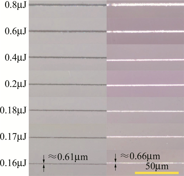 激光直寫刻蝕玻璃方法,按激光波長不同主要分為紅外和紫外激光刻蝕法,而按照激光脈寬不同則可分為:連續(xù)激光刻蝕;納秒、皮秒及飛秒激光刻蝕。YANG等人使用248nm深紫外準(zhǔn)分子激光在石英玻璃表面刻蝕微通道,試驗(yàn)中發(fā)現(xiàn)激光能量密度是決定石英玻璃發(fā)生刻蝕及裂損的主要因素,無裂損刻蝕石英玻璃的激光能量密度閾值區(qū)間應(yīng)在16J/cm2~30J/cm2;而掃描次數(shù)的增加、重復(fù)頻率和微通道深度的增大也會加劇微通道的裂損程度,最后通過加工參量的優(yōu)化(激光能量密度23.5J/cm2,圓弧段重頻為50Hz,直線段重頻為40Hz,掃描1次)實(shí)現(xiàn)了寬度小于100μm的直線型(深度不大于50μm)和圓弧型微通道(深度不大于28.5μm)的無裂損刻蝕。LI等人利用波長為355nm, 脈寬為10ns~25ns的全固態(tài)紫外激光器直寫刻蝕BF33硼硅玻璃微通道,試驗(yàn)中采用單一變量法探究激光能量密度、重復(fù)頻率、掃描速率等參量對刻蝕效果的影響,試驗(yàn)結(jié)果表明,當(dāng)激光能量密度過大時,玻璃易發(fā)生嚴(yán)重崩邊裂損現(xiàn)象,刻蝕深度減小;而隨著重復(fù)頻率的減小,通道碎裂現(xiàn)象減輕,刻蝕深度增大。YU等人采用波長為1030nm、脈寬和重復(fù)頻率分別為290fs, 50kHz的飛秒激光器在石英玻璃樣品上刻蝕線寬小于1μm的凹槽圖案以制備亞微米金屬線,研究了不同脈沖能量激光與燒蝕凹槽及機(jī)械拋光后的金屬線的線寬之間的關(guān)系,如圖 1所示。結(jié)果表明,當(dāng)脈沖能量在0.18μJ以下時,凹槽線寬已降低至1μm以下,最終在石英玻璃上制備出多種不同圖案且線寬穩(wěn)定控制在0.8μm左右的凹槽。