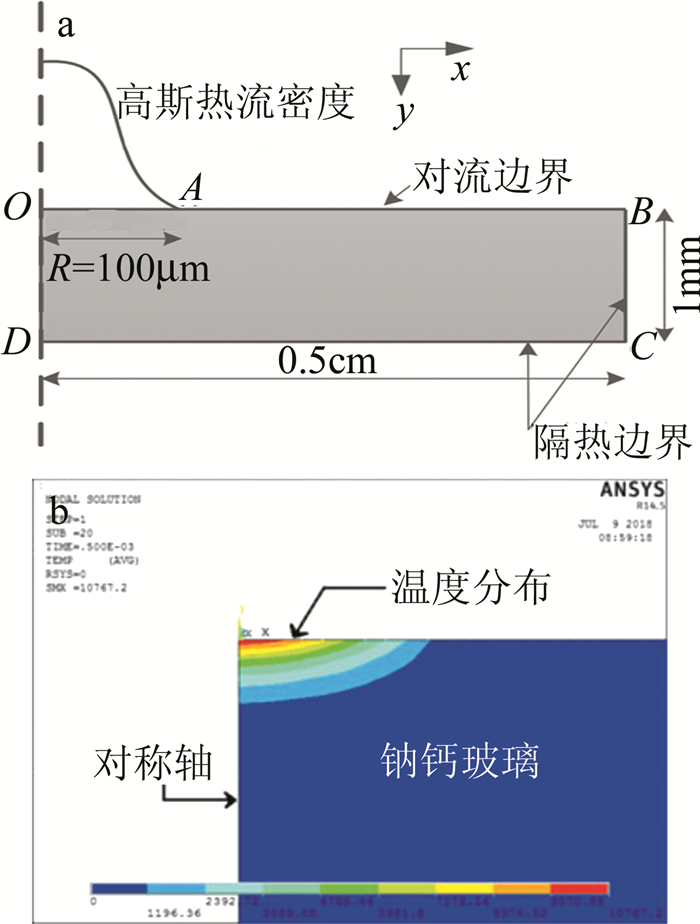 a—2維對稱瞬態(tài)傳熱模型b—單次激光脈沖后的溫度分布