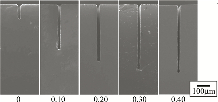 對于激光誘導(dǎo)背部濕法刻蝕,溶劑材料種類和激光工藝參量的選取都對刻蝕質(zhì)量有較大的影響。EHRHARDT等人以甲苯溶液為液體介質(zhì),采用355nm和266nm的皮秒激光對石英玻璃進(jìn)行刻蝕,發(fā)現(xiàn)甲苯溶液中芘的含量對去蝕率有較大影響,且在一定范圍內(nèi)芘的含量越高,去蝕率越大。KWON等人提出在使用波長為1064nm、脈寬為100ns的近紅外激光刻蝕鈉鈣玻璃的過程中,可通過在吸收劑中加入磷酸抑制裂紋的產(chǎn)生,通過對比不同磷酸質(zhì)量分?jǐn)?shù)(0~0.40)的吸收劑刻蝕效果(如圖 5所示)發(fā)現(xiàn),加入磷酸后,可刻蝕深度提高了約5倍(從103μm提高到530μm),且側(cè)壁的粗糙度從0.55μm下降到0.16μm;此外,通過調(diào)整溶液中的磷酸濃度,可以制備出多種不同形狀及深寬比的微通道。SUN等人利用飛秒激光分別在空氣、水和乙醇中加工熔石英玻璃,結(jié)果表明,以乙醇為吸收介質(zhì)時,熔石英玻璃的燒蝕閾值從2.22J/cm2降到了1.02J/cm2,進(jìn)一步研究發(fā)現(xiàn),刻蝕時乙醇比水需更低的激光能量便能達(dá)到形成等離子體的電子密度,同時激光誘導(dǎo)等離子體形成后會在液體中產(chǎn)生氣泡,酒精中的氣泡比水中的對石英表面的沖擊壓力更大。