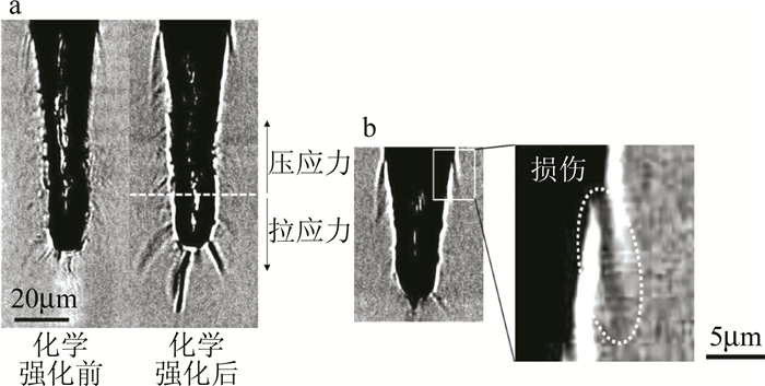 超快激光由于作用時間非常短,加工時的熱滲透很小,在玻璃樣品上不會留下很大的熱影響區(qū)域,能夠有效地減少加工后微裂紋的產(chǎn)生。ARGUMENT使用波長為248nm~800nm、脈寬為130fs~300fs的飛秒激光器在石英玻璃上加工出寬度在25μm~40μm,深度可達(dá)100μm的微孔,后續(xù)研究發(fā)現(xiàn)通過在加工前預(yù)熱玻璃基板,在玻璃基板上預(yù)先制備金屬鎢薄膜,加工后通過過氧化氫腐蝕去除的辦法可以有效地減少裂紋和碎片的產(chǎn)生。CHUANG等人利用波長為1065nm的皮秒激光器在超薄玻璃上加工出一連串直徑為3μm、間隔為2μm~3μm的通孔,在掃描電子顯微鏡(scanning electron microscope,SEM)下觀察玻璃微孔橫截面發(fā)現(xiàn)沒有可見的熔化區(qū),這表明皮秒激光加工微孔時的熱影響區(qū)基本可以忽略不計。ITO等人對化學(xué)強(qiáng)化玻璃進(jìn)行飛秒激光打孔試驗(yàn), 并通過數(shù)值分析加工時的應(yīng)力波的傳播及溫度場的分布,發(fā)現(xiàn)制孔側(cè)壁和底部的殘余應(yīng)力主要是由應(yīng)力波引起的,而孔入口周圍的損傷則與熱應(yīng)力的弛豫有關(guān),如圖 6所示。WEI等人建立了基于飛秒激光抽運(yùn)-探測原理的時間分辨陰影成像平臺,直接獲取了飛秒激光燒蝕石英微孔的超快過程圖像,如圖 7所示。通過對不同能量密度、時間延遲、脈沖條件下拍攝圖像的分析,發(fā)現(xiàn)在飛秒激光燒蝕制備石英微孔的過程中,當(dāng)能量密度低于石英玻璃破壞閾值時,石英玻璃表面觀測到?jīng)_