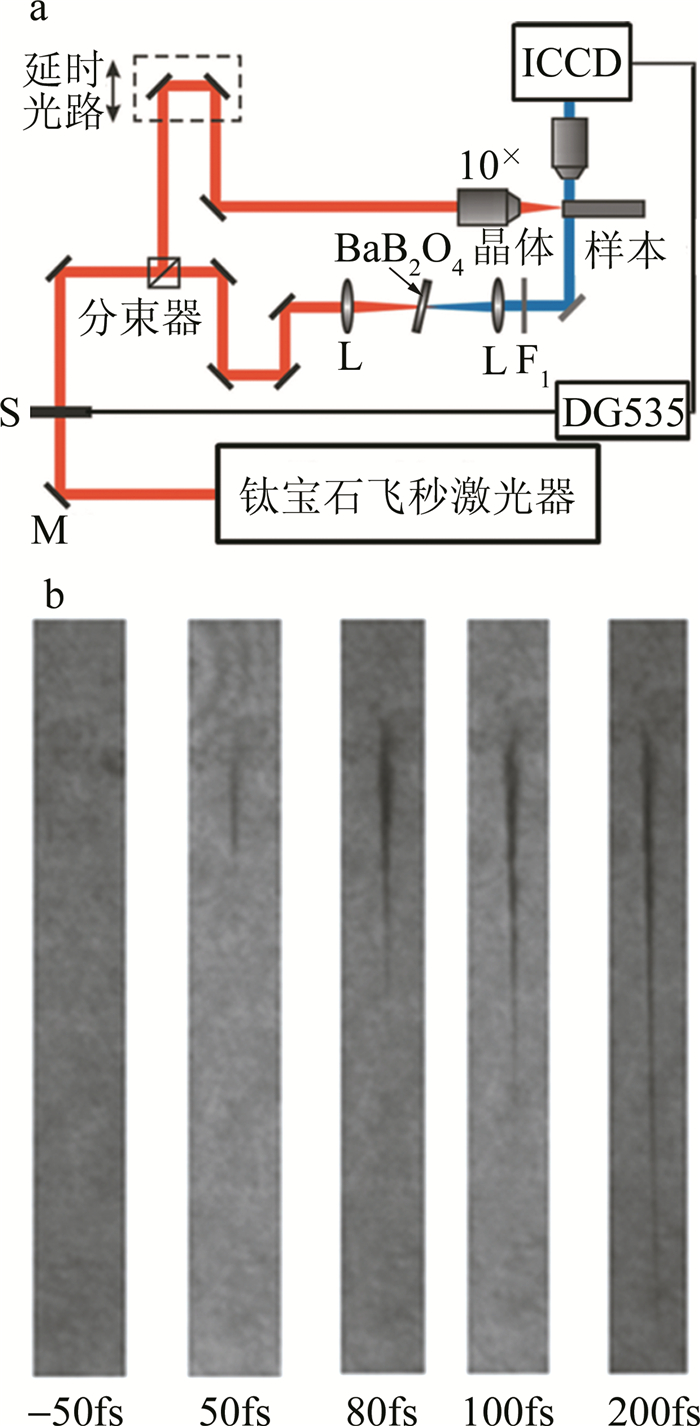 a—時間分辨陰影成像光路圖b—石英介質(zhì)中零延時附近的飛秒激光誘導(dǎo)的等離子通道