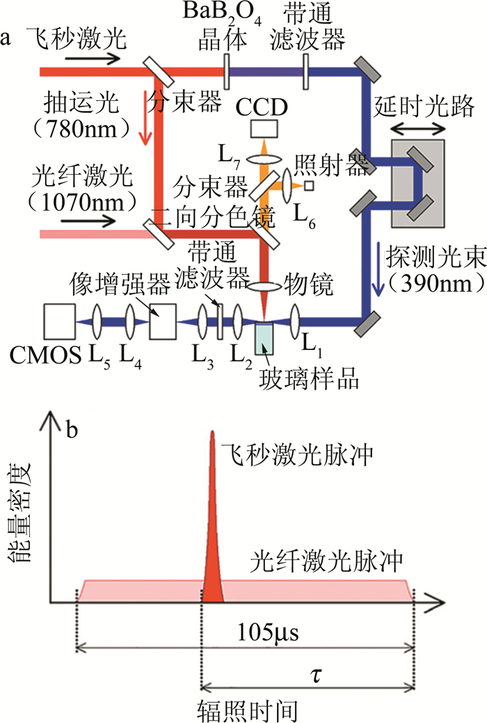 a—試驗(yàn)平臺示意圖b—飛秒激光脈沖和光纖激光脈沖的輻照時間
