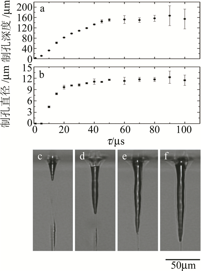針對激光打孔過程中玻璃崩邊及裂紋現(xiàn)象嚴(yán)重,高深徑比微孔加工難度大的瓶頸問題,許多學(xué)者提出了改進(jìn)的打孔方法。為了減少微孔加工時裂紋的產(chǎn)生,KONO等人將二氧化鈰粉末和水的混合物涂覆到玻璃材料的表面后,晾干制成30μm的吸收層,之后再用波長為355nm的納秒激光器進(jìn)行微孔加工,成功在硼硅玻璃和石英玻璃上分別加工出深徑比12以上的微孔,通過對照試驗(yàn)還發(fā)現(xiàn)該方法可以大大減少裂紋的產(chǎn)生,并在不影響加工質(zhì)量的前提下提高加工速度(XY工作臺進(jìn)給速率高達(dá)100μm/s)。針對飛秒激光打孔制孔速度低、制孔時易產(chǎn)生損傷的問題,ITO等人[19]將波長為780nm的飛秒激光器與波長為1070nm的光纖激光器相結(jié)合,如圖 8a所示,加工時首先使用飛秒激光在玻璃基板上加工出高寬深比的細(xì)線,之后將光纖激光輻照到細(xì)線上逐步獲得所需的微孔(其中在飛秒激光輻照后的光纖激光輻照時間定義為時間延遲τ,如圖 8b所示), 研究發(fā)現(xiàn), 飛秒激光產(chǎn)生的細(xì)線會選擇性地吸收光纖激光脈沖利用熱效應(yīng)去除材料,可以有效地避免直接飛秒激光加工過程產(chǎn)生的強(qiáng)應(yīng)力波對材料的損傷,制孔的直徑和深度與τ有關(guān),如圖 9所示。試驗(yàn)結(jié)果表明,該方法在40μs內(nèi)加工出了直徑為10μm、深度達(dá)133μm的微孔,制孔速度只采用飛秒激光加工的5000倍以上, 且能有效地抑制裂紋的產(chǎn)生。為了解決傳統(tǒng)打孔由上至下的加工方式制孔時出現(xiàn)的坡度效應(yīng)(制孔開口表現(xiàn)出入口大出口小的特征),WANG等人[20]提出在加工透明材料時,嘗試采用由下至上的打孔方式代替常規(guī)的由上至下方式,將激光透過材料聚焦于材料的下表面,由底部開始一層層地將材料向上去除, 試驗(yàn)中分別采用波長為532nm的納秒激光、波長為1064nm的皮秒激光及波長為515nm的飛秒激光在康寧大猩猩玻璃上加工孔徑為100μm~120μm、深度為200μm~900μm的微孔, 試驗(yàn)結(jié)果表明,在采用由下至上的加工方式時,脈寬區(qū)間不存在死亡谷(自納秒開始,脈寬愈短,材料移除率愈低,在2ns~50ps之間移除率非常低),脈寬為2ns~50ps的激光切割效率高于超快激光,能夠?qū)崿F(xiàn)零錐度鉆孔且玻璃的崩邊尺寸小于50μm。